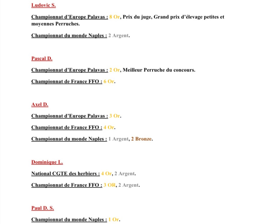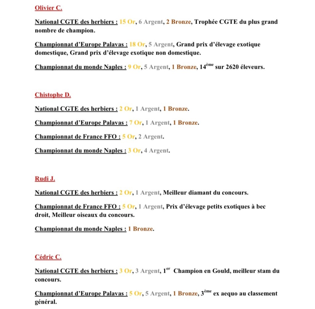 - Régional Châteauroux : 37 Or, grand prix d’élevage exotique domestiques et non domestiques.